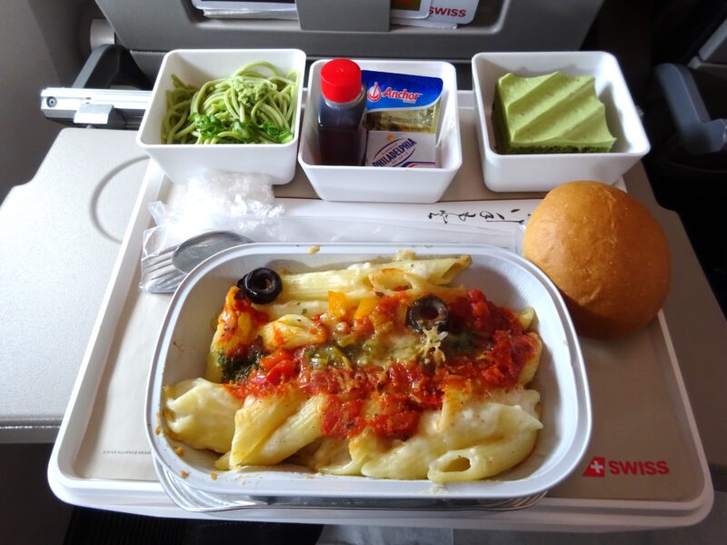 機内食は、主食×3(パスタ・パン・そば)とか、